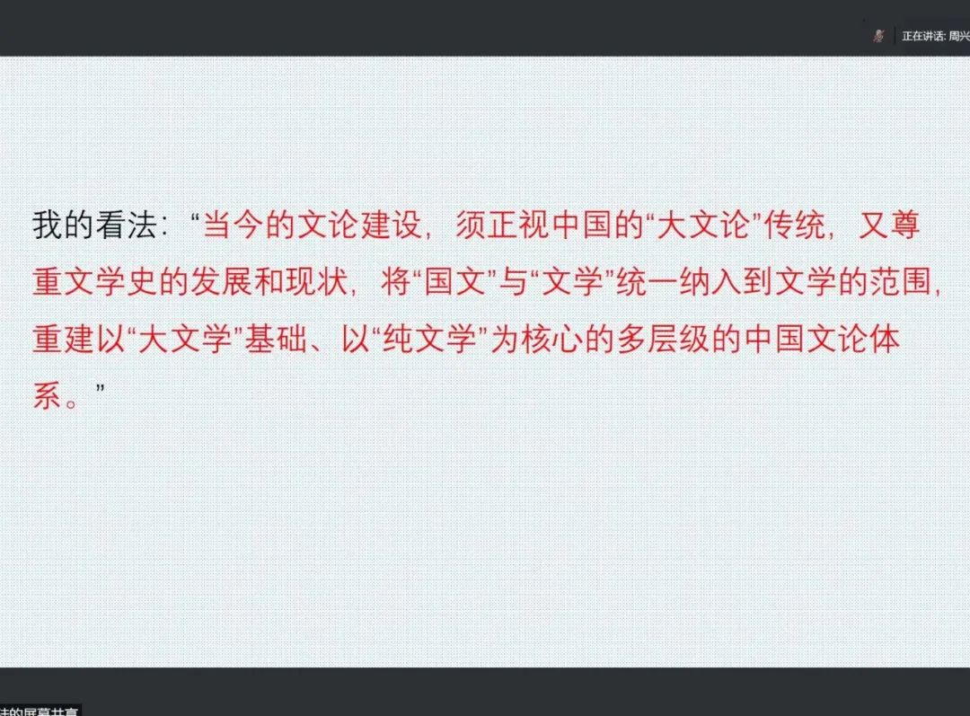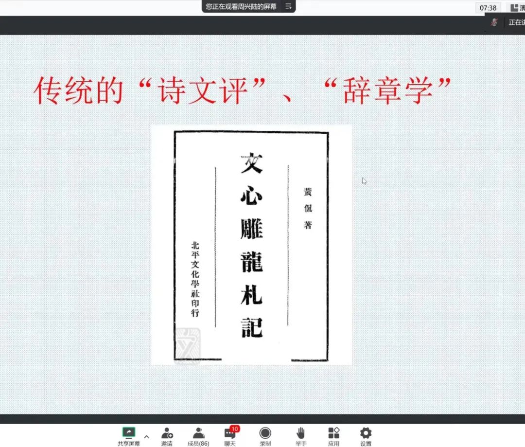 首先,周老师通过回忆百年中国文论研究的范式演变,提出以下问题:其一,中国传统的“诗文评”与“辞章学”向中国现代文学批评史的转变问题;其二,中国文学批评史出现的最早时间问题。围绕这两个问题,周老师结合相关理论著作进行了阐发。