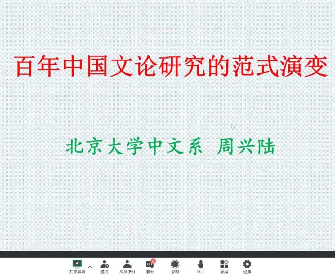 为营造良好的学术氛围,进一步开拓学生的学术视野,9月17日晚7时30分,WilliamHill中文举办了题为“百年中国文论研究的范式演变”的学术讲座,讲座采用线上的形式展开。本次讲座特邀北京大学中文系教授,博士生导师周兴陆老师主讲,WilliamHill中文杨志云副教授主持,WilliamHill中文、宁夏其他高校部分师生参加了此次讲座。周老师从过去百年中国社会历史文化发展进程为切入点,通过梳理百年来中国文学批评史研究学术范式的历史变革,进而揭示了其理论观念、学术方法,成就与不足,并对中国传统文论研究应对外来文化,走向现代,参与中国当代文论建设的问题进行了相关阐述。
