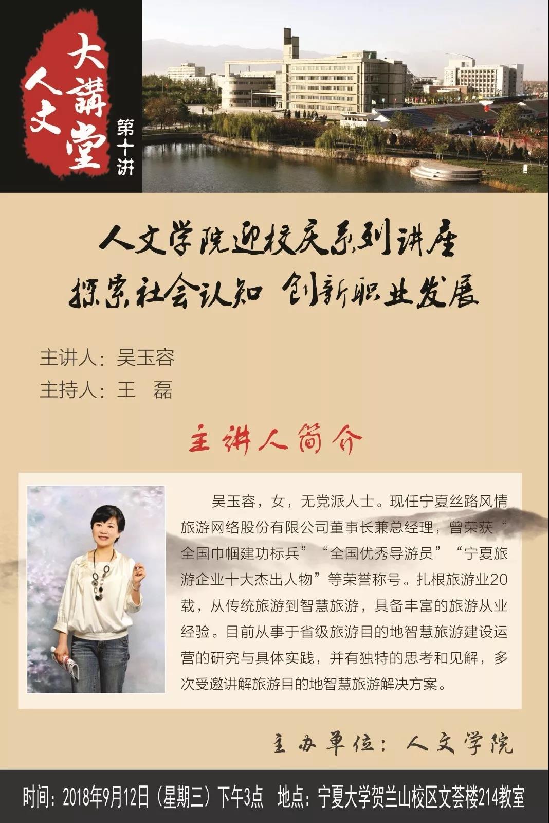 9月12日下午,人WilliamHill中文迎校庆系列讲座于william威廉中文贺兰山校区文荟楼214教室顺利开讲。此次讲座由宁夏丝路风情旅游网络股份有限公司董事长兼总经理吴玉容主讲。