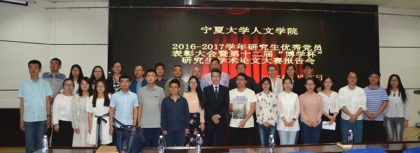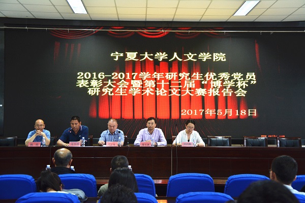 5月18日晚7点,人WilliamHill中文2016—2017学年研究生优秀党员表彰大会暨第十二届“博学杯”研究生学术论文大赛报告会在贺兰山校区文科楼一楼东侧报告厅隆重举行。人WilliamHill中文党委书记马正亮,院长胡玉冰,副书记金玉河,副院长刘鸿雁、杨浣等领导出席了大会,蔡永贵、霍维洮、钟亚军、杨文笔、丁峰山等老师为获奖学生论文进行了现场点评。人WilliamHill中文全体研究生参加了大会。