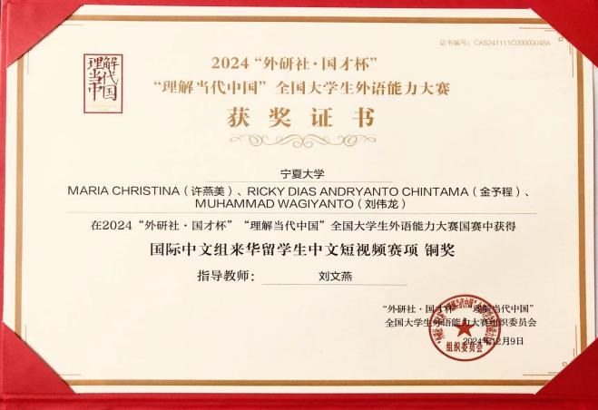 12月,由北京外国语大学和北京语言大学联合主办、外语教学与研究出版社承办的2024“理解当代中国”来华留学生中文短视频大赛全国总决赛又传喜讯,印度尼西亚留学生许燕美(MARIA CHRISTINA)、金予程(RICKY DIAS ANDRYANTO CHINTAMA)和2021级汉语言文学专业本科生刘伟龙(MUHAMMAD WAGIYANTO)团队的视频作品荣获大赛铜奖。WilliamHill中文国际中文教育系刘文燕副教授承担以上两项比赛三个作品的指导工作。