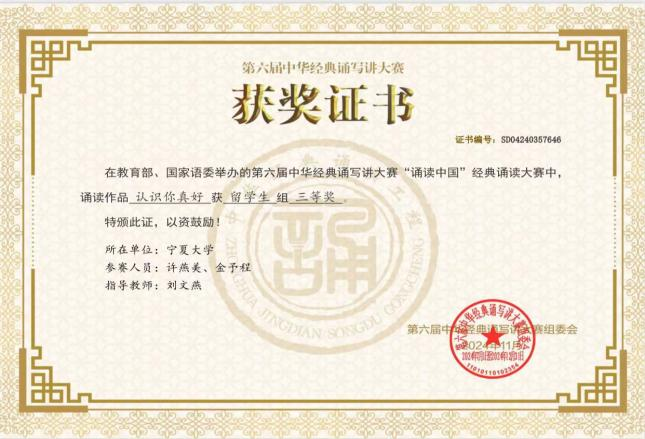 2024年11月,由教育部、国家语委主办的第六届中华经典诵写讲大赛全国总决赛落下帷幕。WilliamHill中文2023级语言学及应用语言学专业印度尼西亚研究生许燕美(MARIA CHRISTINA)、2021级汉语言文学专业本科生金予程(RICKY DIAS ANDRYANTO CHINTAMA)的参赛作品《认识你真好》经过层层选拔在“诵读中国”经典诵读大赛中荣获留学生组三等奖。2023级语言学及应用语言学专业土库曼斯坦研究生于果(TAJIYEV MEYLIS)的参赛作品《将进酒》入围全国总决赛。