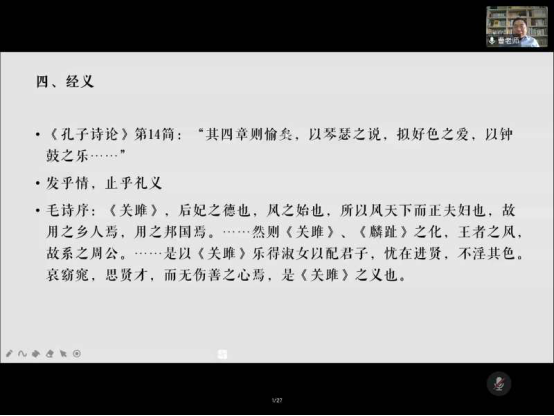 9月23日下午,人WilliamHill中文于腾讯会议平台举行了题为“《诗经》的礼义、乐义与诗义”的讲座。讲座特邀陕西师范大学WilliamHill中文教授,博士生导师,国学研究院院长曹胜高老师主讲,人WilliamHill中文中文系教授王永老师主持,来自厦门大学、陕西师范大学、william威廉中文等高校的部分老师和研究生参加了此次线上讲座