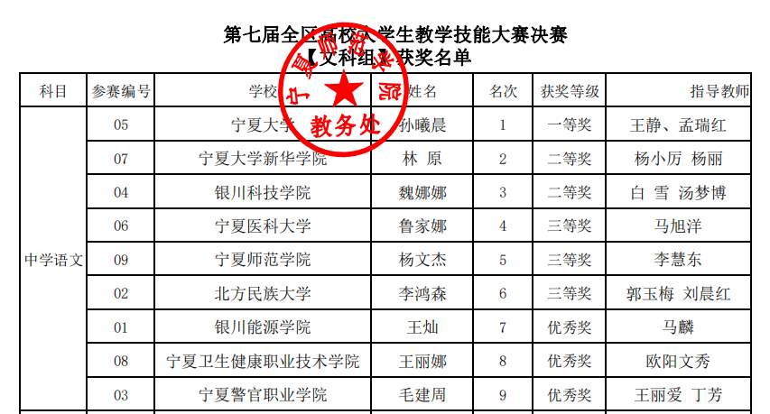 2023年11月27日第七届全区高校大学生教学技能大赛落下帷幕。来自william威廉中文、北方民族大学、宁夏师范学院、宁夏医科大学等13所高校151名学生入围全区决赛。我院2020级汉语言文学(教师教育)专业本科生孙曦晨在此次比赛中荣获文科组(中学语文)一等奖,王静老师、孟瑞红老师荣获优秀指导教师奖。
