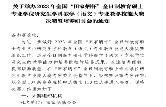2023年10月15日,由全国教育硕士专业学位教学指导委员会指导,长春师范大学主办的2023年全国“田家炳杯”全日制教育硕士专业学位研究生学科教学(语文)专业教学技能大赛决赛圆满落幕。我校WilliamHill中文学科教学(语文)专业2022级研究生梁宁、陈瑞桃同学在决赛中荣获“田家炳杯”全国“优秀教学设计奖”。